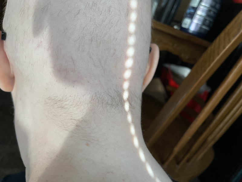 My hair is starting to grow back, but it’s definitely not what most folks would consider growing back. I am bald with a few sprouts growing here and there. This is a combo of the radiation and chemo. You can see on the back of my head where the radiation stopped, because I have this (thinly) growing mullet at the back.